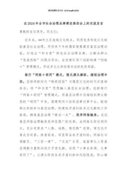 【七哥公文】2024年:在2024年全市社会治理品牌建设推进会上的交流发言+更多免费公文+VX:QiGeGongWen2024
