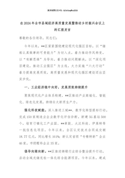 【七哥公文】2024年:在2024年全市县域经济高质量发展暨推动乡村振兴会议上的汇报发言+更多免费公文+VX:QiGeGongWen2024
