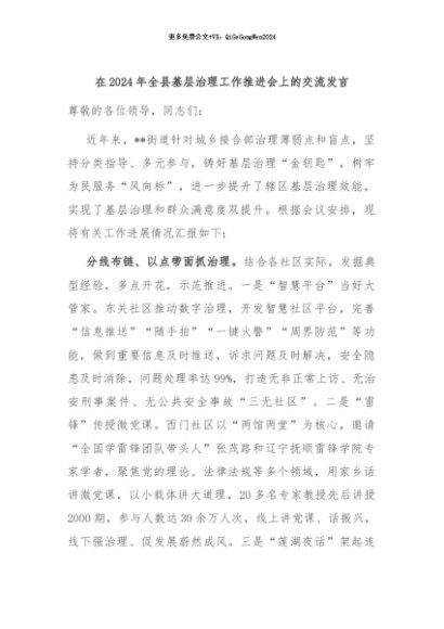 / 【七哥公文】2024年:在2024年全县基层治理工作推进会上的交流发言+更多免费公文+VX:QiGeGongWen2024