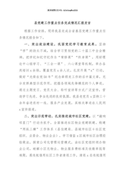 / 【七哥公文】2024年:县党建工作重点任务完成情况汇报发言+更多免费公文+VX:QiGeGongWen2024