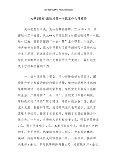 【七哥公文】2024年:大学(高校)派驻村第一书记工作心得感悟+更多免费公文+VX:QiGeGongWen2024