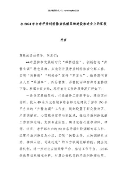 【七哥公文】2024年:在2024年全市矛盾纠纷排查化解品牌建设推进会上的汇报发言+更多免费公文+VX:QiGeGongWen2024