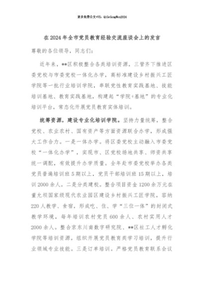 / 【七哥公文】2024年:在2024年全市党员教育经验交流座谈会上的发言+更多免费公文+VX:QiGeGongWen2024