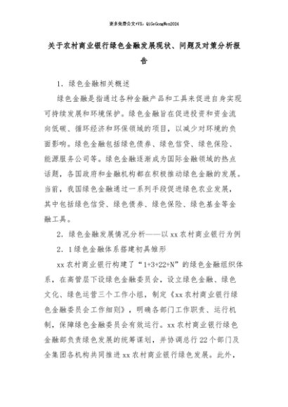 【七哥公文】2024年:关于农村商业银行绿色金融发展现状、问题及对策分析报告 (1)+更多免费公文+VX:QiGeGongWen2024