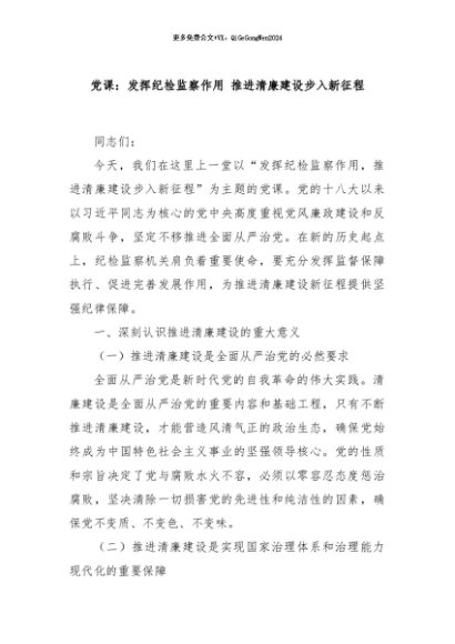 / 【七哥公文】2024年:党课:发挥纪检监察作用 推进清廉建设步入新征程+更多免费公文+VX:QiGeGongWen2024