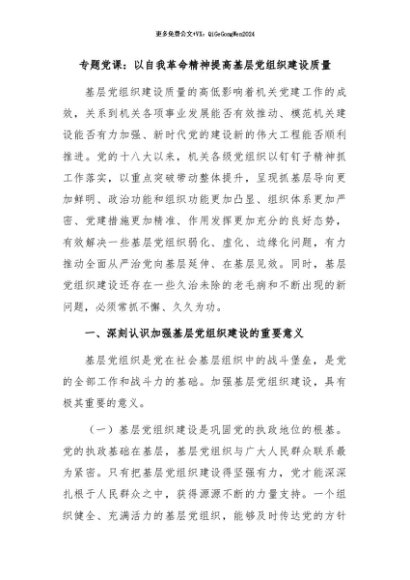 / 【七哥公文】2024年:专题党课:以自我革命精神提高基层党组织建设质量+更多免费公文+VX:QiGeGongWen2024