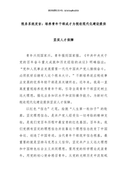 【七哥公文】2024年:税务系统发言:培养青年干部成才为税收现代化建设提供坚实人才保障+更多免费公文+VX:QiGeGongWen2024