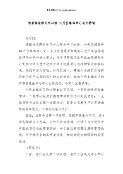 / 【七哥公文】2024年:市委理论学习中心组10月份集体学习会主持词+更多免费公文+VX:QiGeGongWen2024