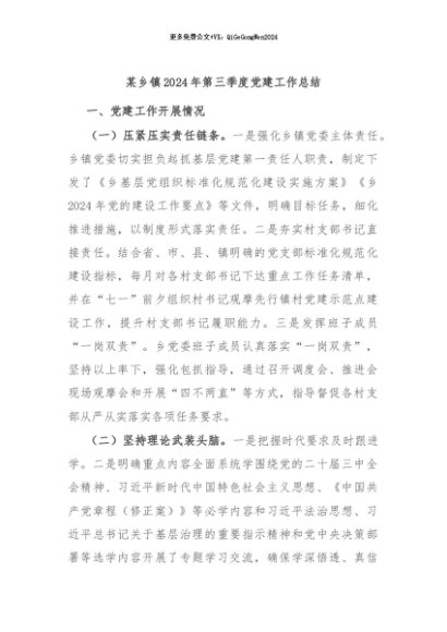 / 【七哥公文】2024年:某乡镇2024年第三季度党建工作总结+更多免费公文+VX:QiGeGongWen2024