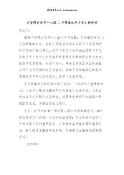 / 【七哥公文】2024年:市委理论学习中心组10月份集体学习会主持讲话+更多免费公文+VX:QiGeGongWen2024