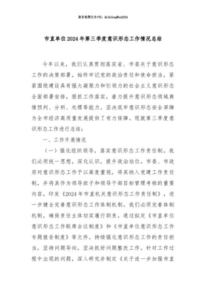 / 【七哥公文】2024年:市直单位2024年第三季度意识形态工作情况总结+更多免费公文+VX:QiGeGongWen2024