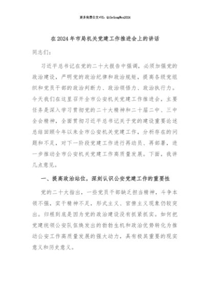 / 【七哥公文】2024年:在2024年市局机关党建工作推进会上的讲话+更多免费公文+VX:QiGeGongWen2024