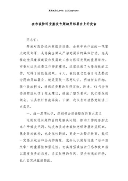 / 【七哥公文】2024年:在市政协巡查整改专题动员部署会上的发言+更多免费公文+VX:QiGeGongWen2024