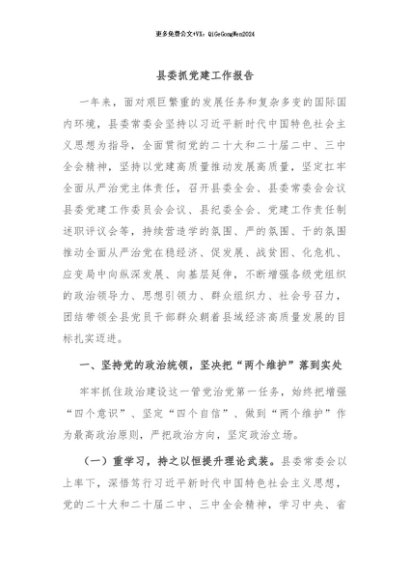 【七哥公文】2024年:县委抓党建工作报告+更多免费公文+VX:QiGeGongWen2024