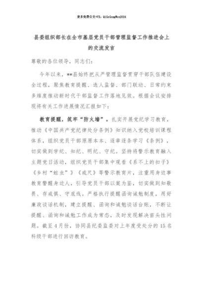 【七哥公文】2024年:县委组织部长在全市基层党员干部管理监督工作推进会上的交流发言+更多免费公文+VX:QiGeGongWen2024