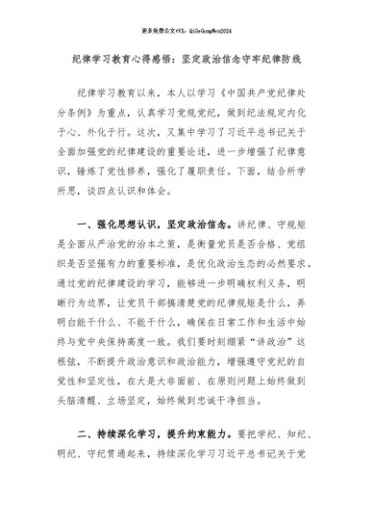 【七哥公文】2024年:纪律学习教育心得感悟:坚定政治信念守牢纪律防线+更多免费公文+VX:QiGeGongWen2024