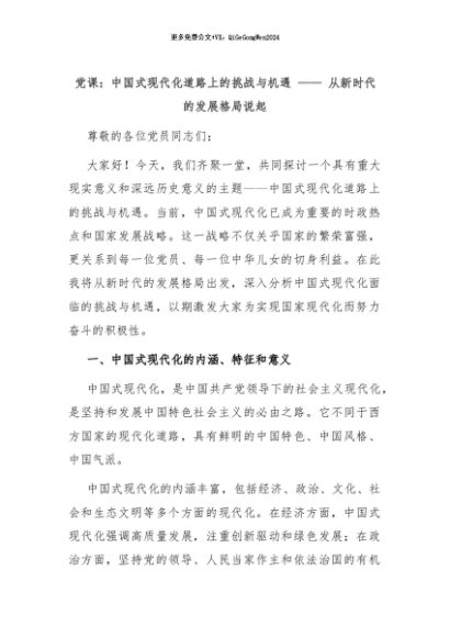 【七哥公文】2024年:党课:中国式现代化道路上的挑战与机遇 —— 从新时代的发展格局说起+更多免费公文+VX:QiGeGongWen2024