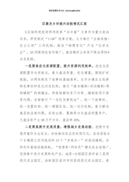 / 【七哥公文】2024年:区激发乡村振兴动能情况汇报+更多免费公文+VX:QiGeGongWen2024