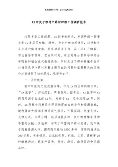 / 【七哥公文】2024年:XX市关于推进中药材种植工作调研报告+更多免费公文+VX:QiGeGongWen2024