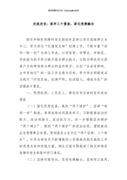 / 【七哥公文】2024年:交流发言:筑牢三个堡垒,深化党建融合+更多免费公文+VX:QiGeGongWen2024