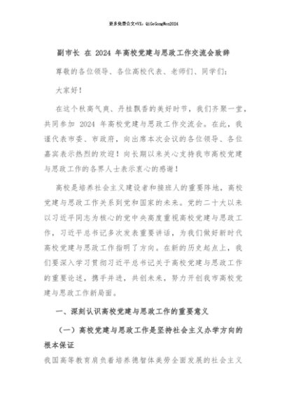 【七哥公文】2024年:副市长 在 2024 年高校党建与思政工作交流会致辞+更多免费公文+VX:QiGeGongWen2024