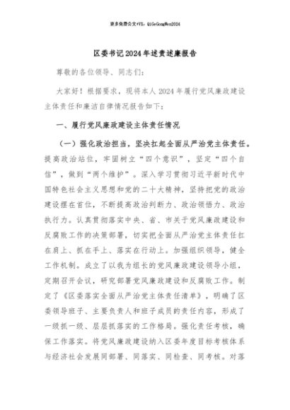 / 【七哥公文】2024年:区委书记2024 年述责述廉报告+更多免费公文+VX:QiGeGongWen2024