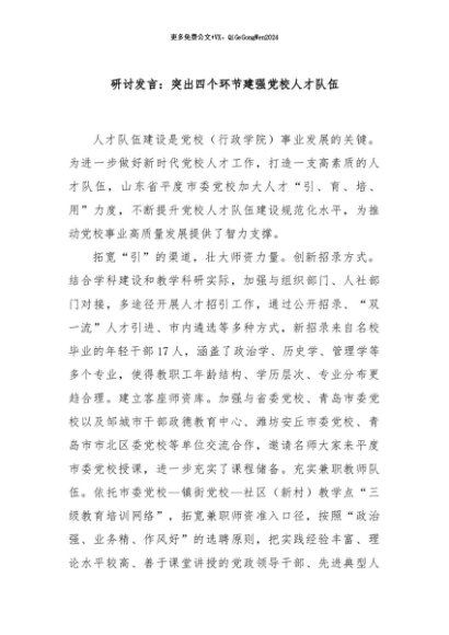 / 【七哥公文】2024年:研讨发言:突出四个环节建强党校人才队伍+更多免费公文+VX:QiGeGongWen2024