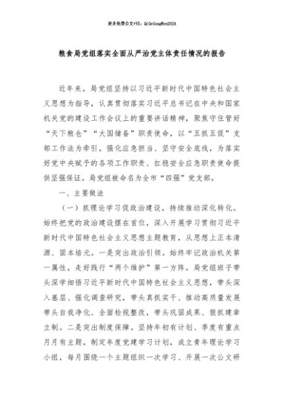 / 【七哥公文】2024年:粮食局党组落实全面从严治党主体责任情况的报告+更多免费公文+VX:QiGeGongWen2024