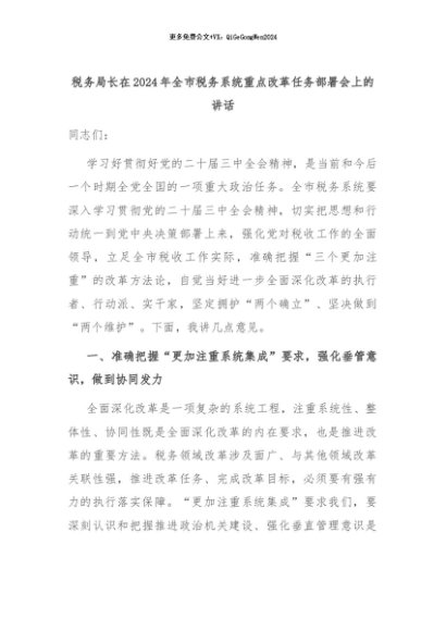 【七哥公文】2024年:税务局长在2024年全市税务系统重点改革任务部署会上的讲话+更多免费公文+VX:QiGeGongWen2024