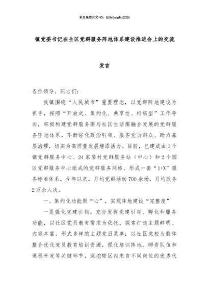【七哥公文】2024年:镇党委书记在全区党群服务阵地体系建设推进会上的交流发言+更多免费公文+VX:QiGeGongWen2024