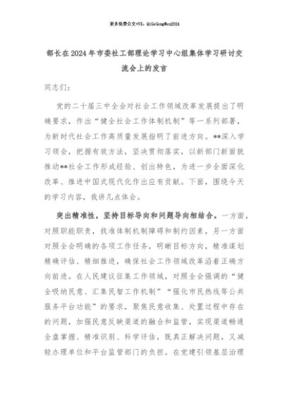 【七哥公文】2024年:部长在2024年市委社工部理论学习中心组集体学习研讨交流会上的发言+更多免费公文+VX:QiGeGongWen2024