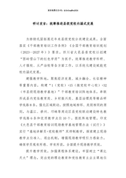 / 【七哥公文】2024年:研讨发言:统筹推进县级党校内涵式发展+更多免费公文+VX:QiGeGongWen2024