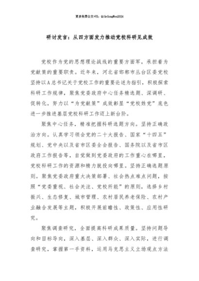 / 【七哥公文】2024年:研讨发言:从四方面发力推动党校科研见成效+更多免费公文+VX:QiGeGongWen2024