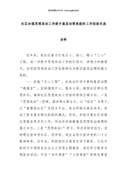 【七哥公文】2024年:社区加强思想政治工作提升基层治理效能的工作经验交流材料+更多免费公文+VX:QiGeGongWen2024