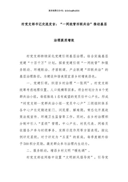 【七哥公文】2024年:村党支部书记交流发言:“一网统管四联共治”推动基层治理提质增效+更多免费公文+VX:QiGeGongWen2024