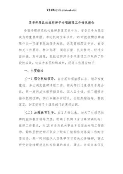 / 【七哥公文】2024年:某市开展乱挂机构牌子专项清理工作情况报告+更多免费公文+VX:QiGeGongWen2024