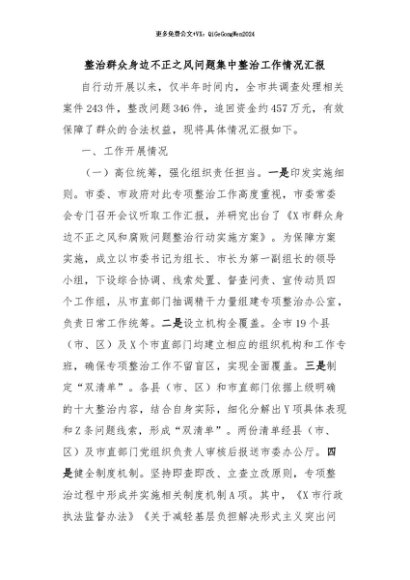 / 【七哥公文】2024年:整治群众身边不正之风问题集中整治工作情况汇报+更多免费公文+VX:QiGeGongWen2024
