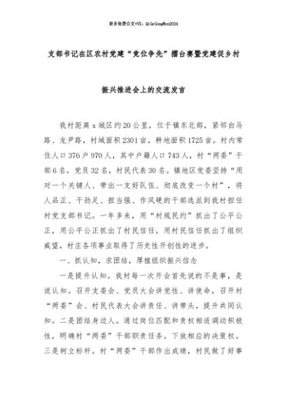 【七哥公文】2024年:支部书记在区农村党建“竞位争先”擂台赛暨党建促乡村振兴推进会上的交流发言+更多免费公文+VX:QiGeGongWen2024