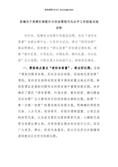 【七哥公文】2024年:某镇关于党建引领提升乡村治理现代化水平工作经验交流材料+更多免费公文+VX:QiGeGongWen2024