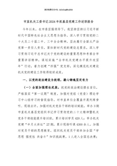 / 【七哥公文】2024年:市直机关工委书记2024年抓基层党建工作述职报告+更多免费公文+VX:QiGeGongWen2024
