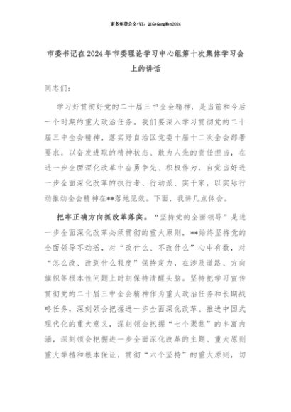【七哥公文】2024年:市委书记在2024年市委理论学习中心组第十次集体学习会上的讲话+更多免费公文+VX:QiGeGongWen2024