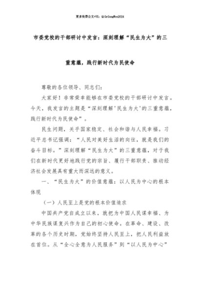 【七哥公文】2024年:市委党校的干部研讨中发言:深刻理解“民生为大”的三重意蕴,践行新时代为民使命+更多免费公文+VX:QiGeGongWen2024