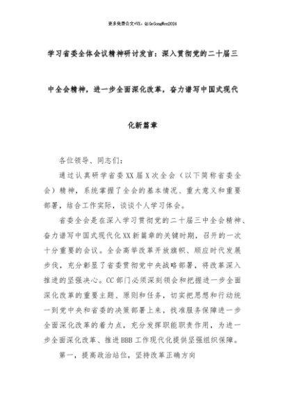 【七哥公文】2024年:学习省委全体会议精神研讨发言:深入贯彻党的二十届三中全会精神,进一步全面深化改革,奋力谱写中国式现代化新篇章+更多免费公文+VX:QiGeGongWen2024
