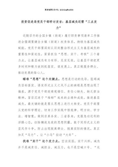 【七哥公文】2024年:投资促进局党员干部研讨发言:基层减负还需“三点发力”+更多免费公文+VX:QiGeGongWen2024