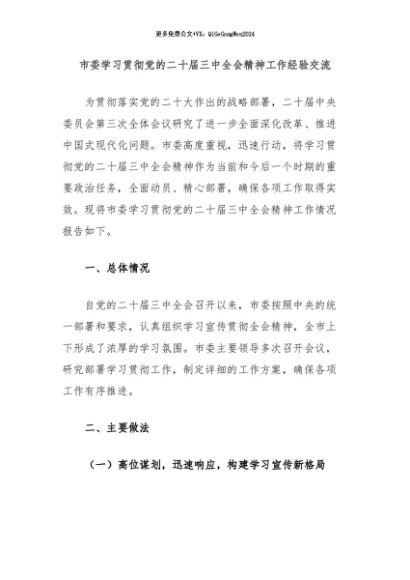 / 【七哥公文】2024年:市委学习贯彻党的二十届三中全会精神工作经验交流+更多免费公文+VX:QiGeGongWen2024