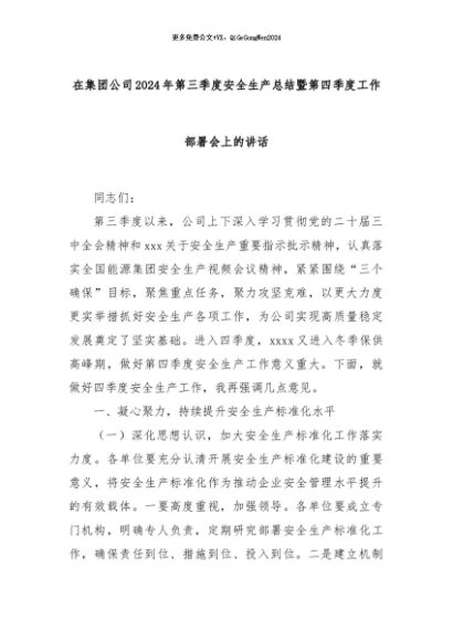 【七哥公文】2024年:在集团公司2024年第三季度安全生产总结暨第四季度工作部署会上的讲话+更多免费公文+VX:QiGeGongWen2024