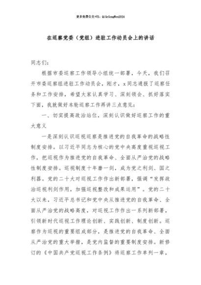 / 【七哥公文】2024年:在巡察党委(党组)进驻工作动员会上的讲话+更多免费公文+VX:QiGeGongWen2024