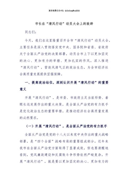 / 【七哥公文】2024年:市长在“清风行动”动员大会上的致辞+更多免费公文+VX:QiGeGongWen2024