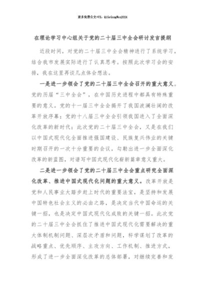 【七哥公文】2024年:在理论学习中心组关于党的二十届三中全会研讨发言提纲+更多免费公文+VX:QiGeGongWen2024