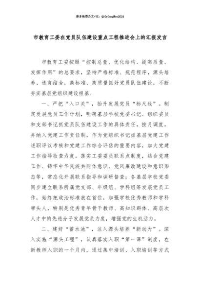 【七哥公文】2024年:市教育工委在党员队伍建设重点工程推进会上的汇报发言+更多免费公文+VX:QiGeGongWen2024
